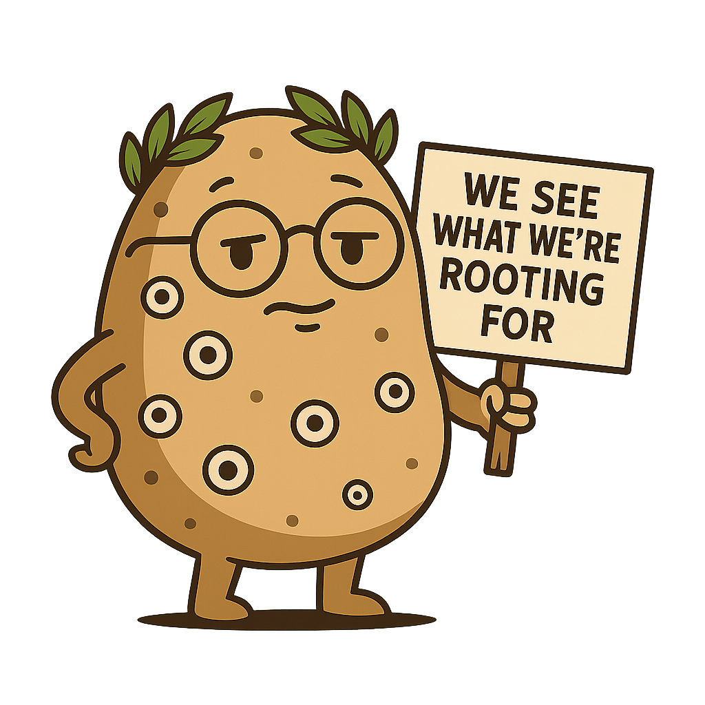 I stamp the agenda with the official seal: a slightly anxious, many-eyed potato in a laurel wreath, holding a sign that reads WE SEE WHAT WE’RE ROOTING FOR. It is extremely stupid. It is extremely right.